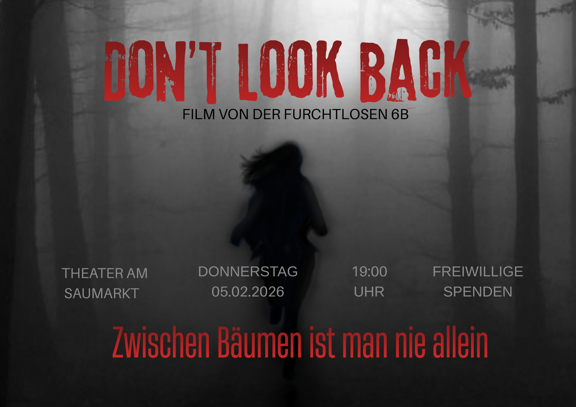 „Don’t look back“ – ein Kurzfilm-Thriller der 6b – feiert am Donnerstag, den 05.02.2026, um 19:00 Uhr im Theater am Saumarkt Premiere.
