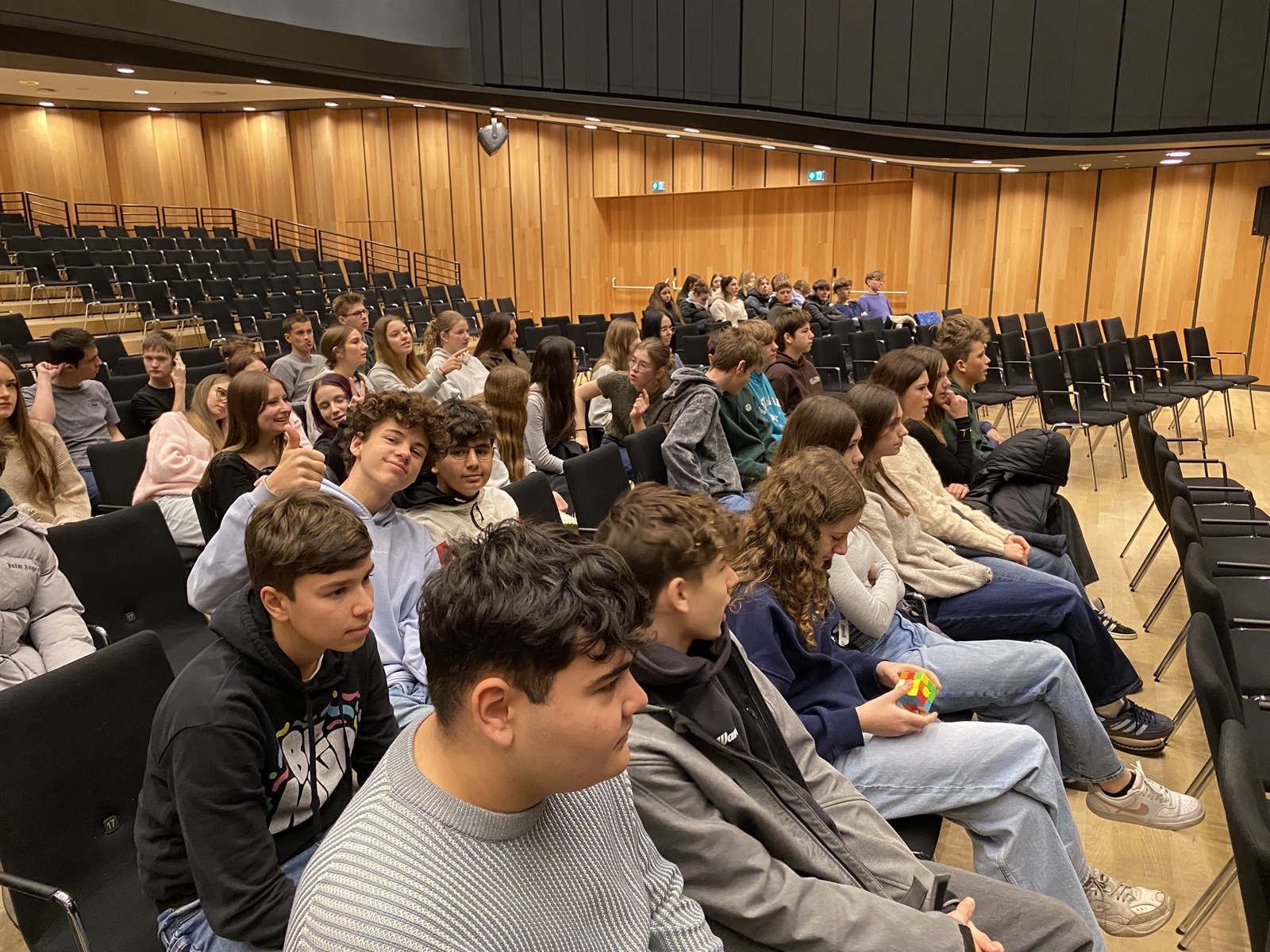 Vergangenen Freitag folgten Schüler:innen der Klassen 5ac, 6a und 5d einer Einladung des Sinfonieorchesters Vorarlberg (SOV), um einer Generalprobe beizuwohnen. Sie kamen dabei in den Genuss von Dvořáks 7. Sinfonie und erhielten Einblick in die Probenarbeit des Chefdirigenten Leo McFall.