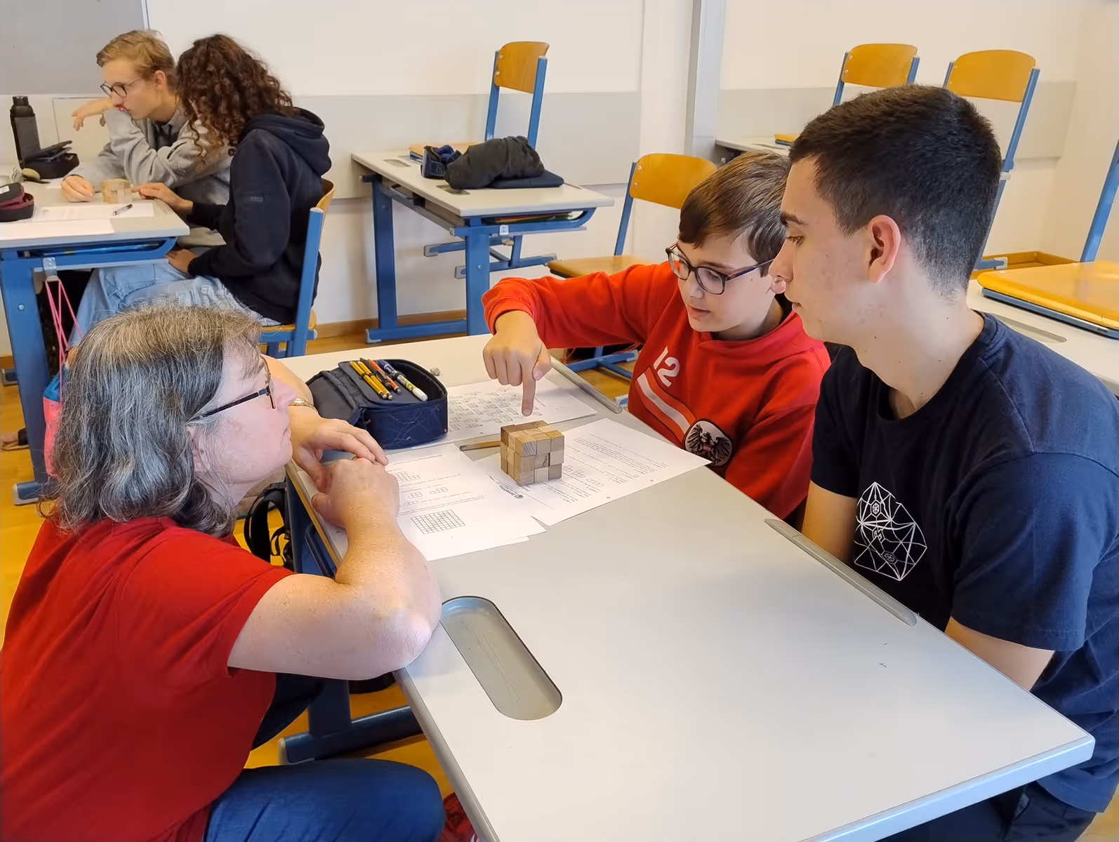 Am Freitag hielten sie einen Workshop über Färbungsbeweise im Mathematik-Olympiaden-Kurs. Die Kursteilnehmer:innen experimentierten in bester Laune mit den aus Holz angefertigten Triminos und Pentominoes und sammelten erste Erfahrungen darin, wie man eine Aussage exakt widerlegen kann.