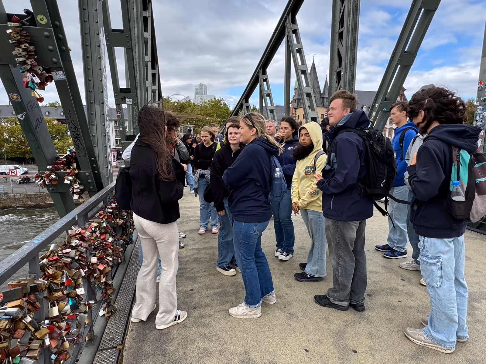 Am Montagmorgen wurden wir herzlich in der großen Kopernikusschule mit 2.500 Schülern begrüßt und starteten gleich gruppenweise mit verschiedenen Gewässeruntersuchungen am und im Hasselbach. Am Dienstag fuhren wir nach Frankfurt zum Stadtwaldhaus, wo wir an interessanten Wald-Workshops teilnahmen. Danach ging es in die Frankfurter Innenstadt, wo wir Stadtführungen von den Schüler:innen aus Freigericht erhielten.