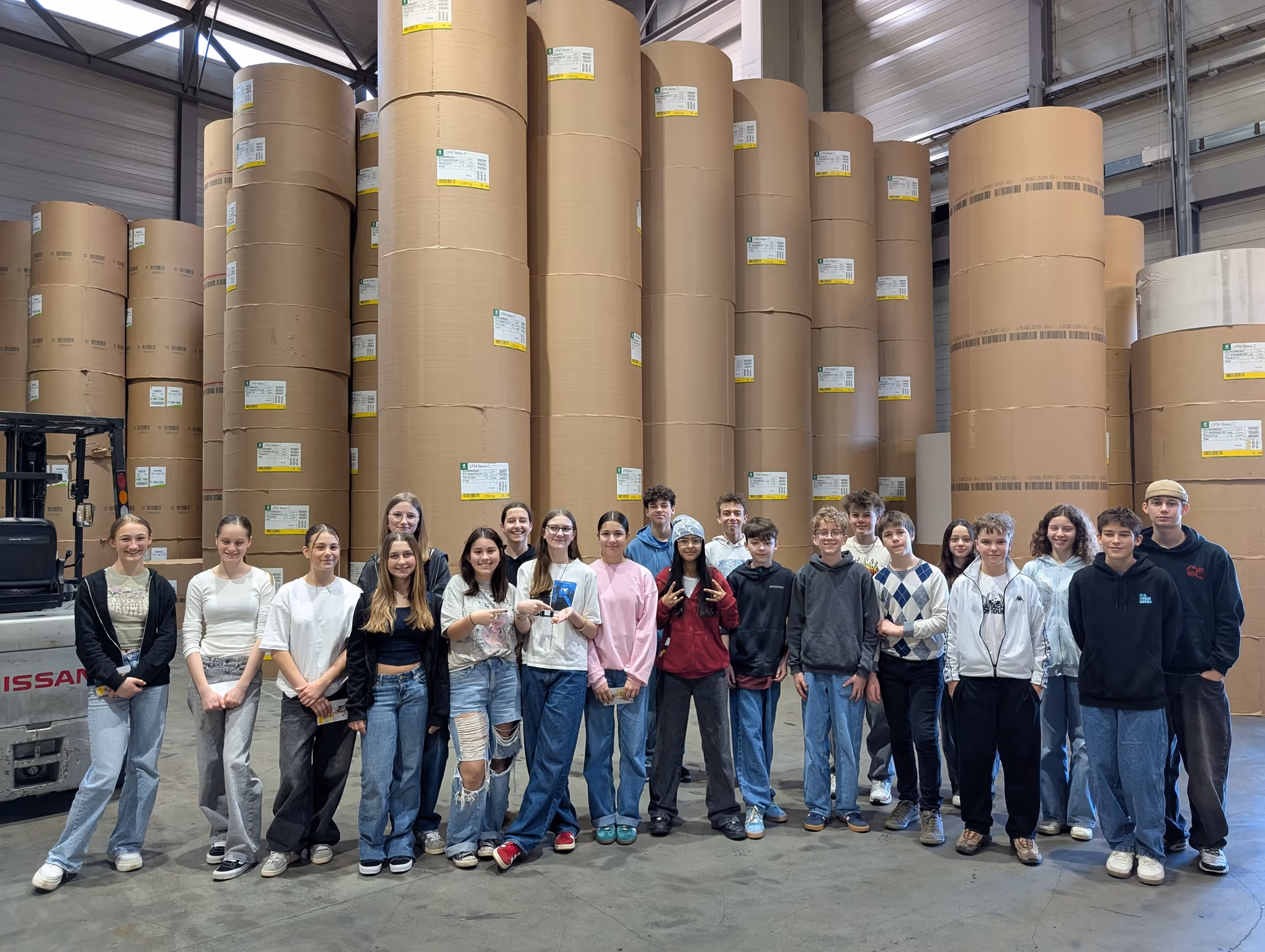 Anschließend wurden wir von Frau Ritter in das große Papierlager der Vorarlberger Nachrichten geführt. Türme von kilometerlangen Papierrollen stapeln sich dort bis zur Decke. Wir durften uns sogar auf ein paar Rollen stellen! Zusätzlich wurden wir in die Druckerei und in einen Saal voller „Zeitungsstraßen“ gebracht. Dort werden die Zeitungen der Vorarlberger Nachrichten verpackt und zur Auslieferung bereit gemacht.