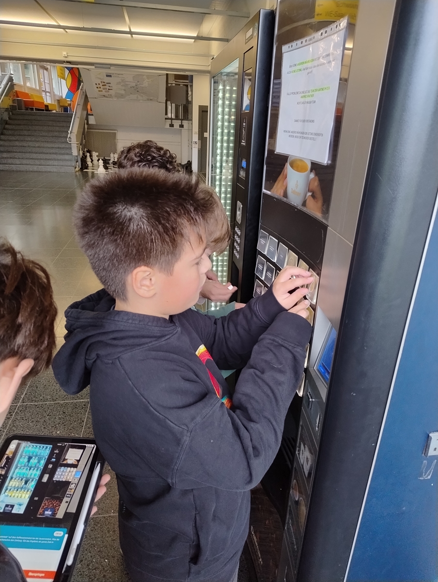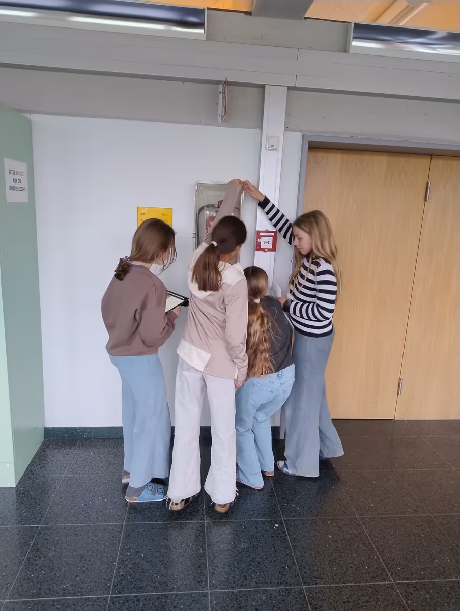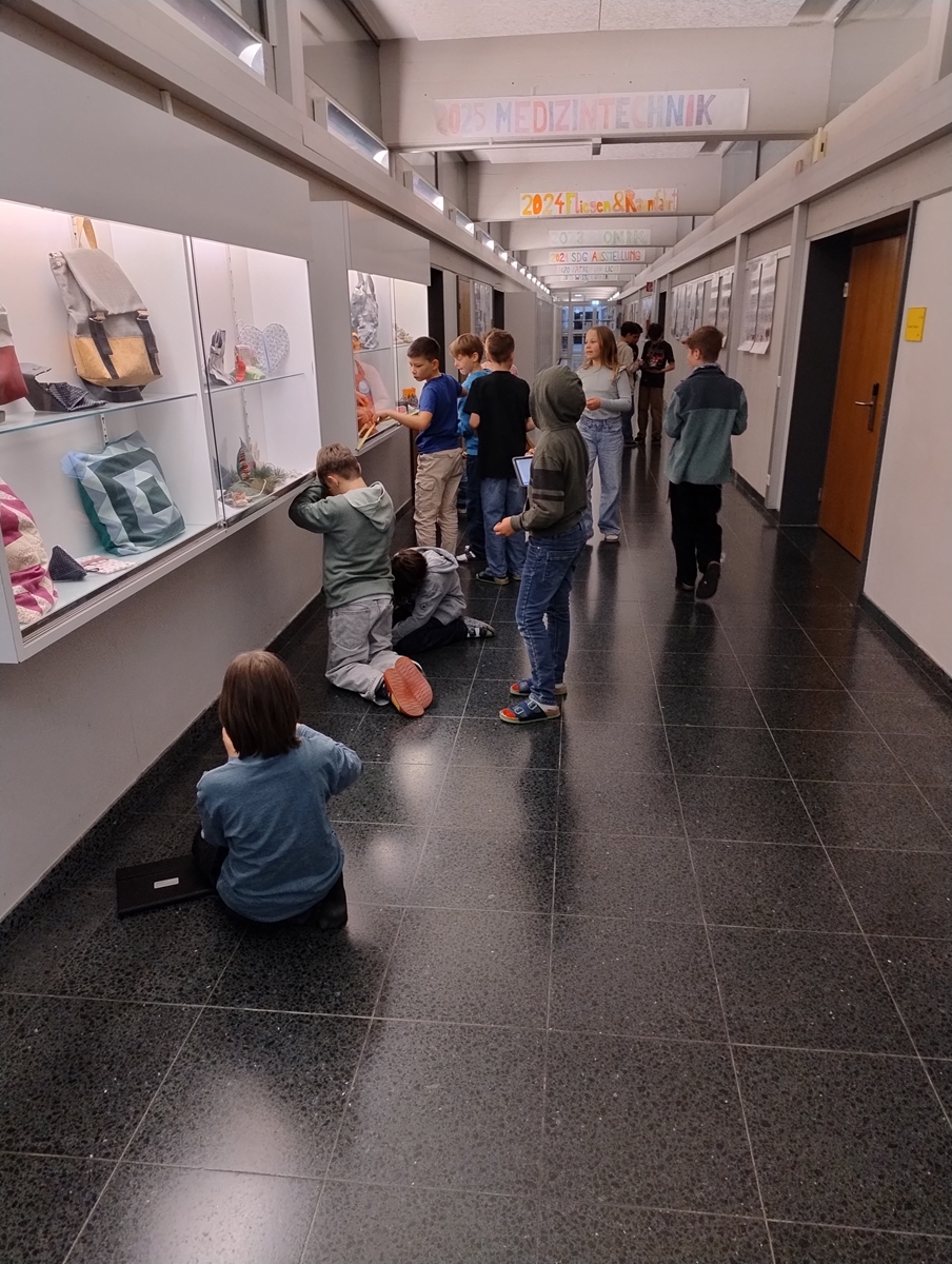 Die Klasse 1d hat kürzlich den Indoor-Mathepfad zum Thema Längenmessung in der Schule getestet. Ausgestattet mit Maßband und der App MathCityMap begaben sich die Schüler:innen auf die Suche nach den neun Stationen. Diese waren, wie bei einer Schnitzeljagd, mithilfe von Hinweisen zu finden. An den verschiedenen Aufgaben mussten die Kinder zum Beispiel bestimmen, wie breit die Treppen sind, wie lang der Flur bei den Biosälen ist oder wie tief eine der Vitrinen ist. Sie erlebten dabei hautnah, dass Mathematik überall direkt vor unserer Nase liegt, und hatten viel Spaß an der spielerischen Herausforderung.