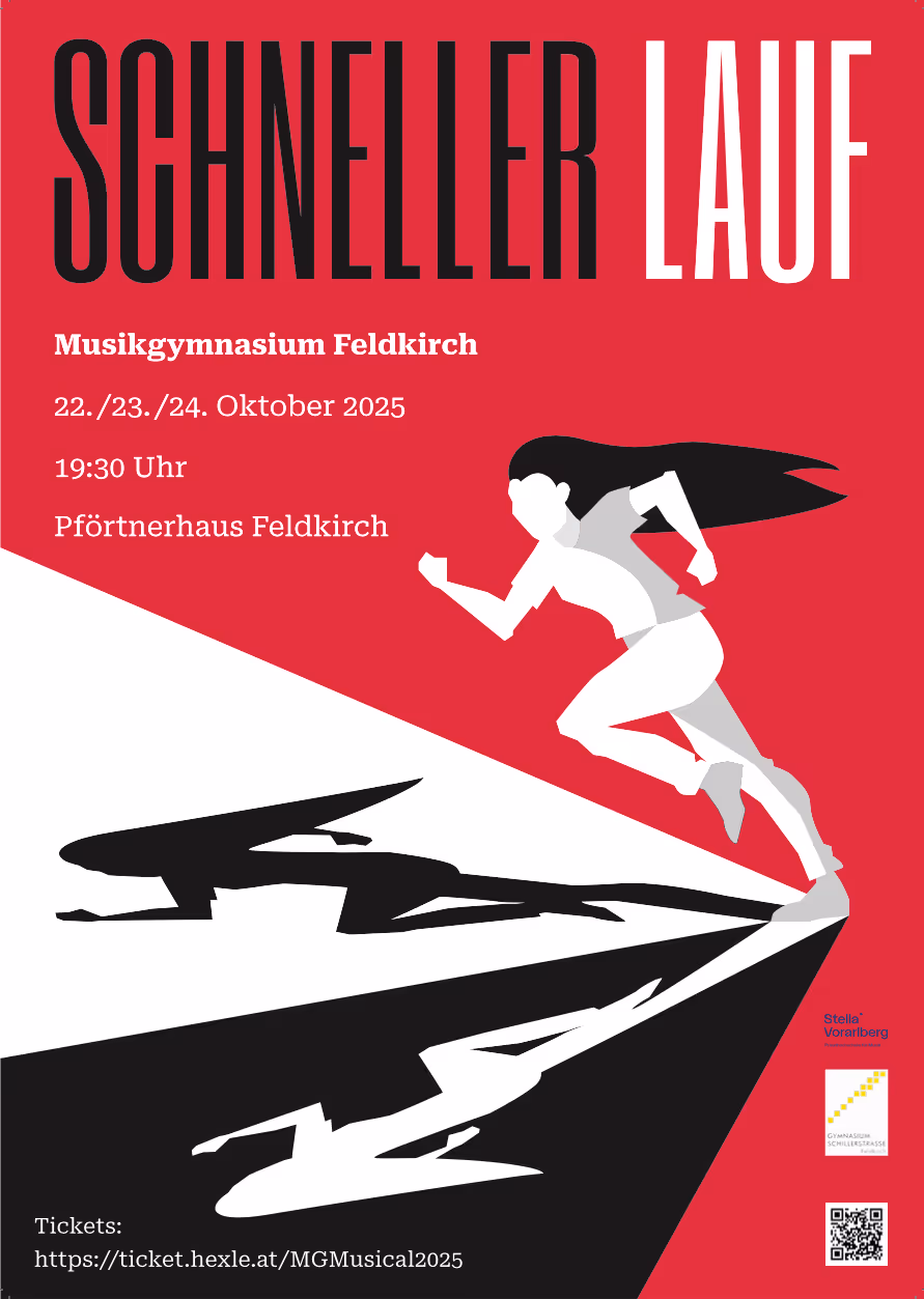 Das Musikgymnasium freut sich bekanntzugeben, dass das diesjährige Musical „Schneller Lauf“ an den drei Abenden vor den Herbstferien im Pförtnerhaus Feldkirch aufgeführt wird.
