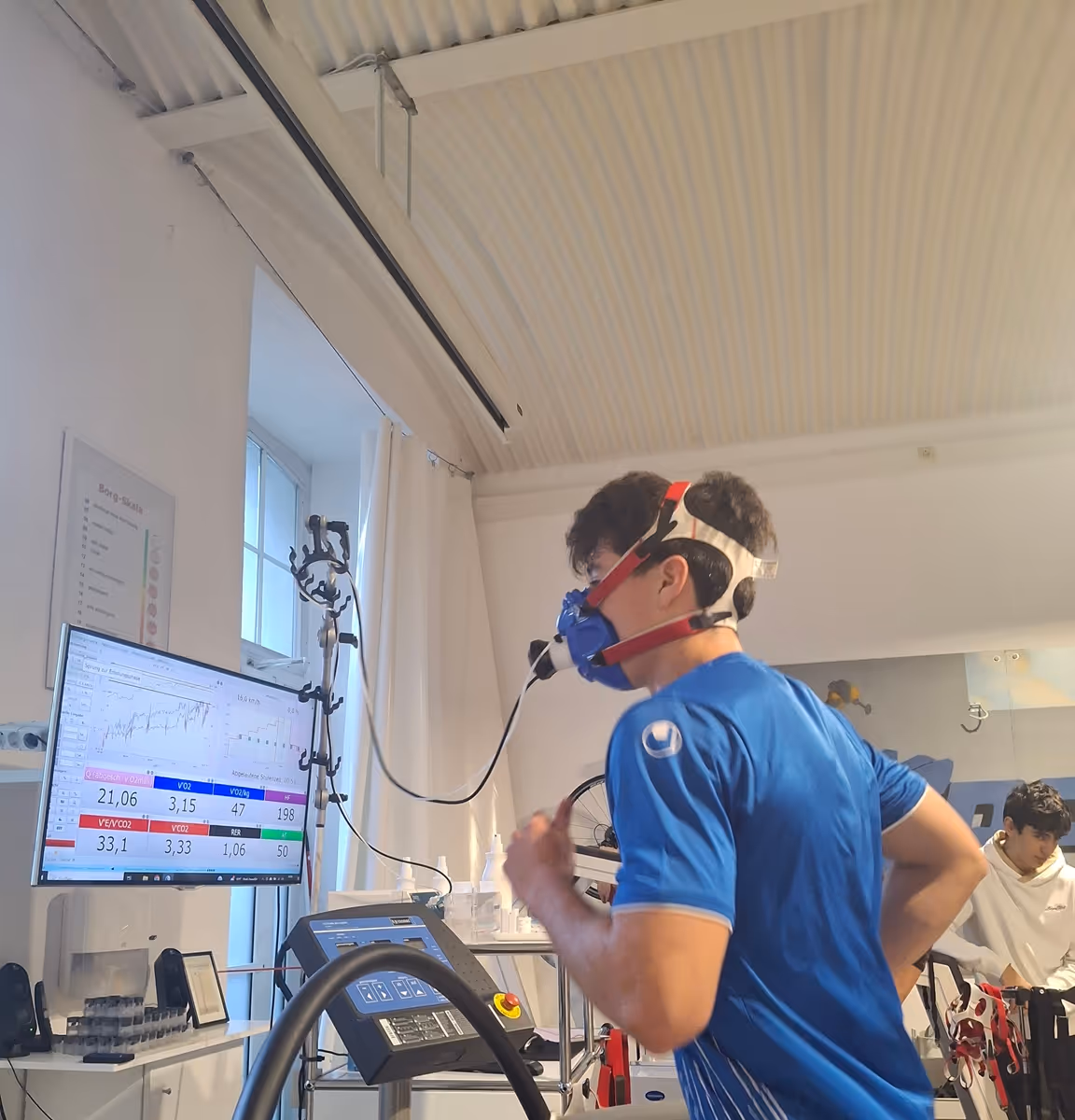 Leandro Konzett, aktiver Fußballer aus unserer WPF-Klasse, stellte sich freiwillig der Challenge: Start bei 6 km/h, alle drei Minuten eine Steigerung um 2 km/h, dazu jedes Mal ein kurzer Stich, sprich „Laktatabnahme“ beim Ohrläppchen zur Laktatmessung. Mit einer Sauerstoffmaske wurde außerdem sein Atemverhalten (VO₂) exakt aufgezeichnet.