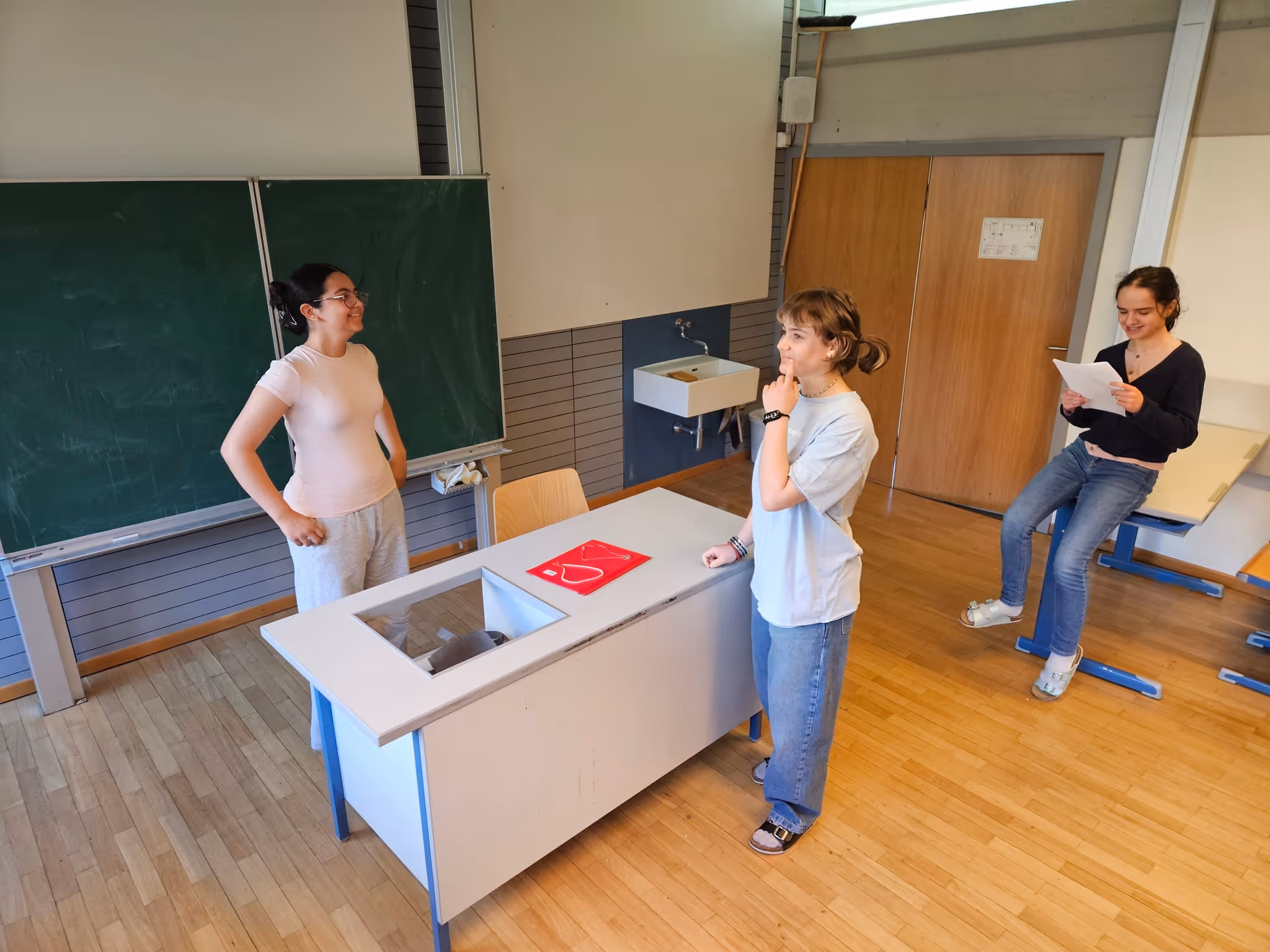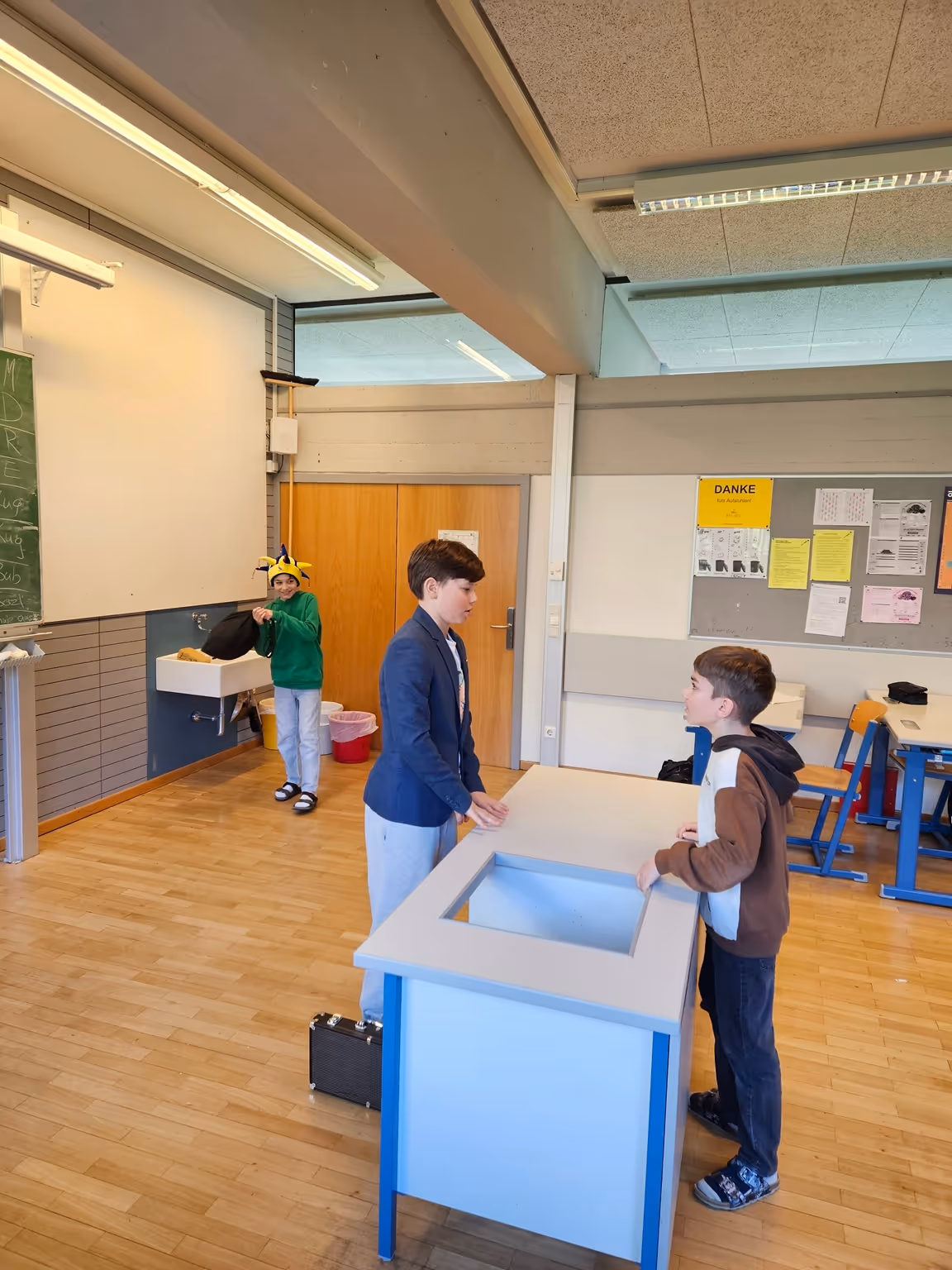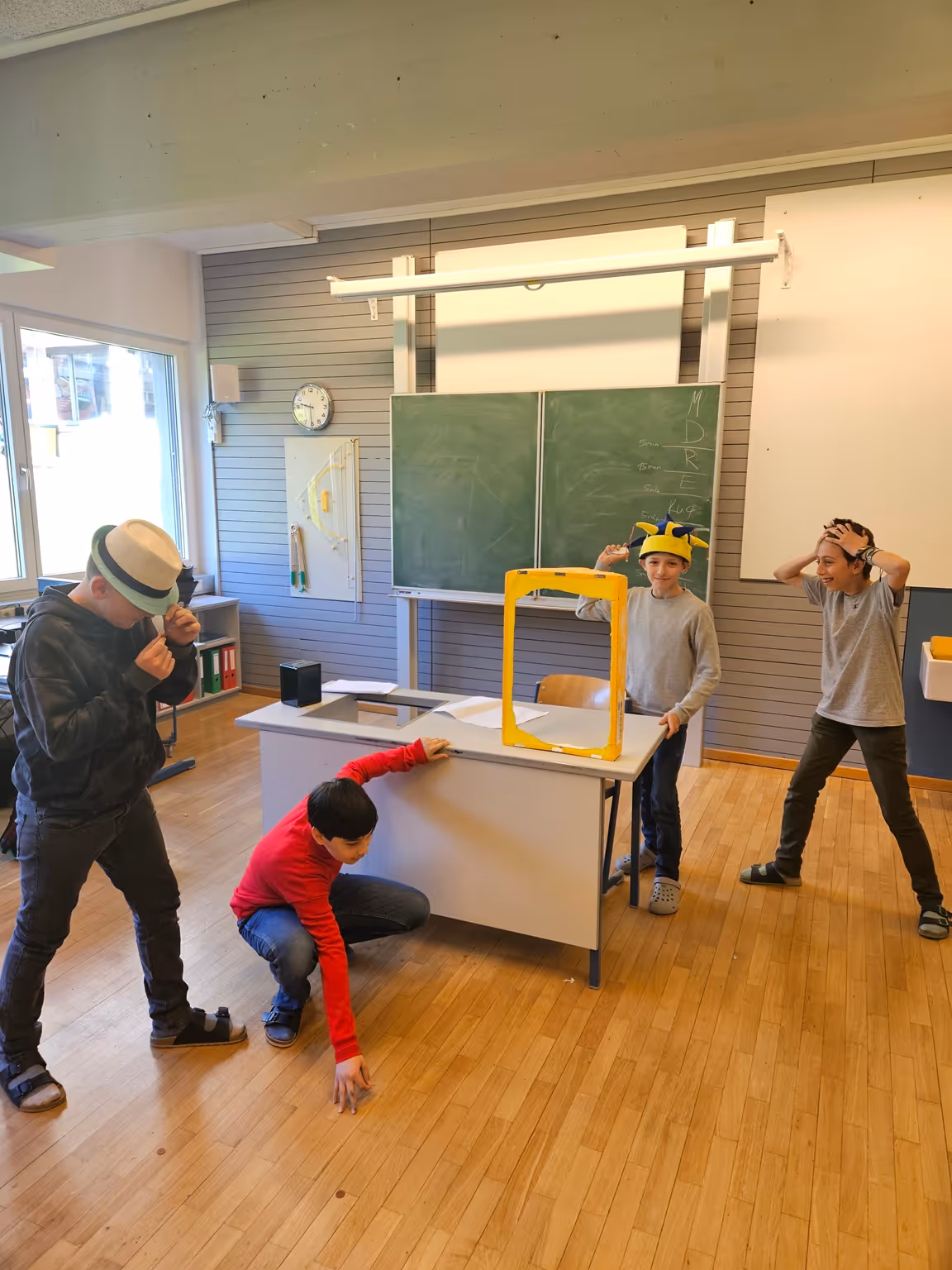 Dann war der Zeitpunkt gekommen: An zwei Tagen führten wir unsere Geschichten in unserem Klassenzimmer vor unserer Klasse vor. Alle gaben sich viel Mühe, was man klar erkennen konnte, und die Theaterstücke wurden mit Applaus und einigen Lachern belohnt. Diese Art der Stundengestaltung hat uns sehr gut gefallen und ich hoffe, wir können so etwas wieder einmal machen.