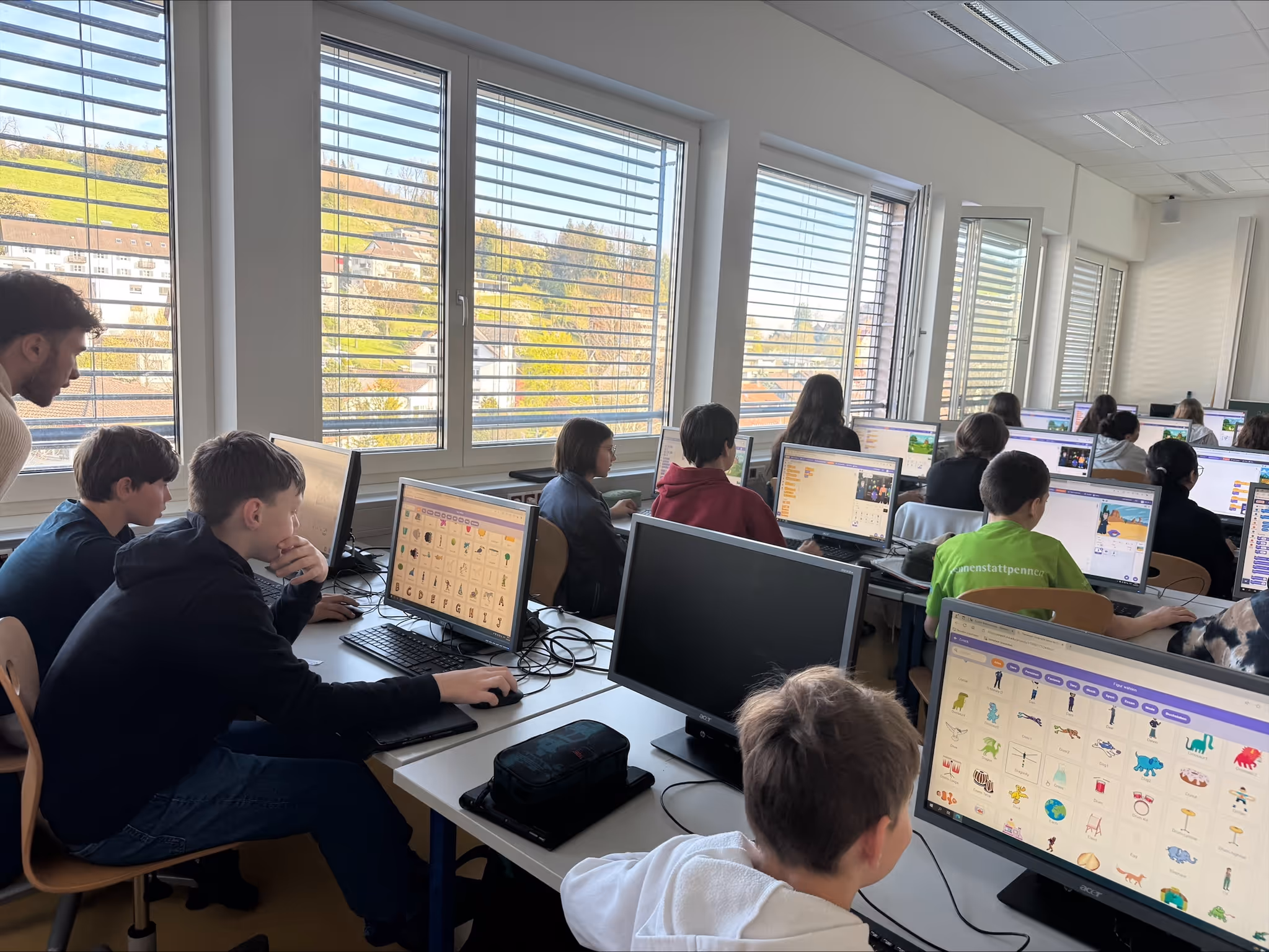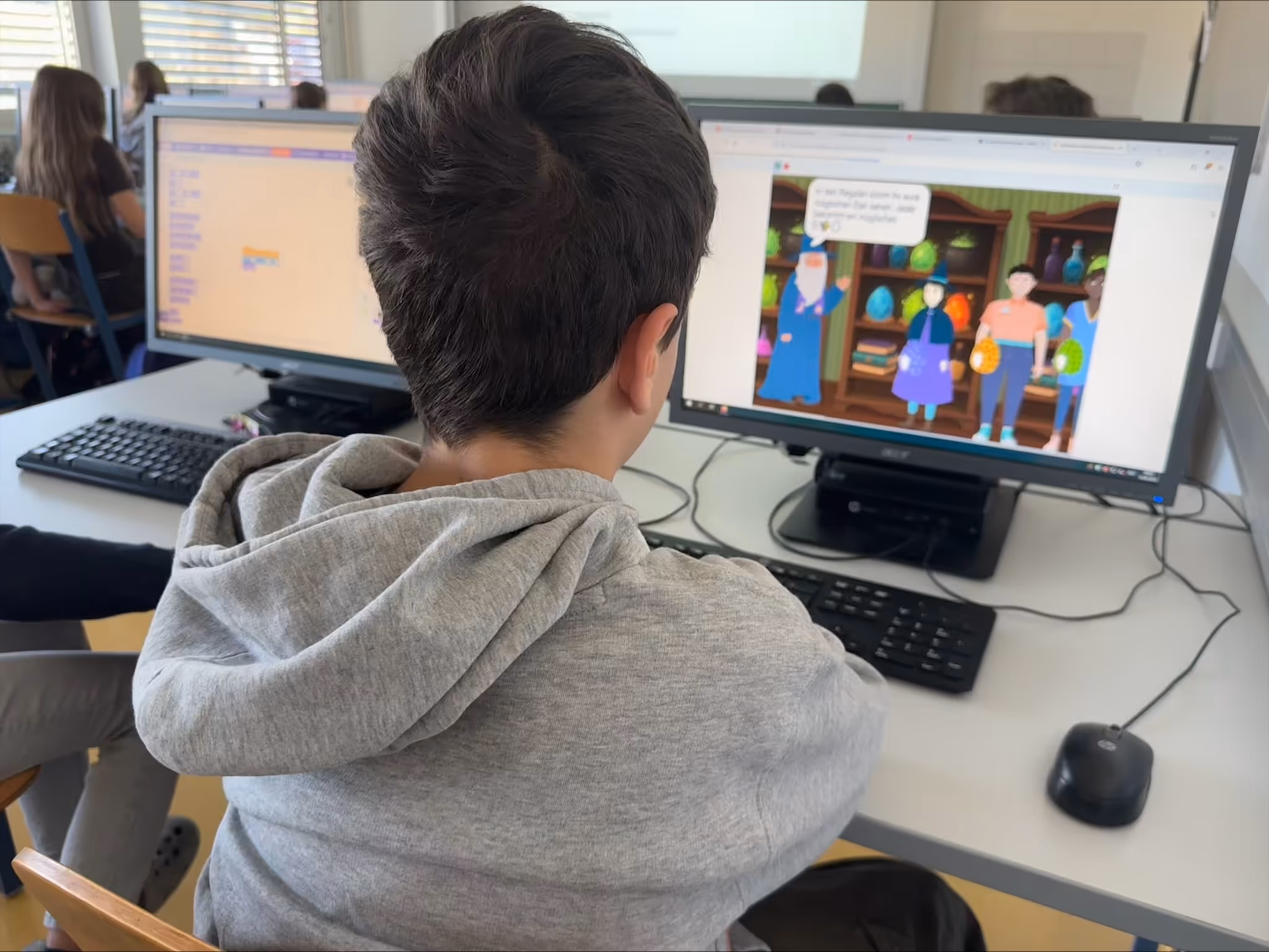 Am Donnerstag, dem 10. April 2025, nahmen wir, die 2b, im Rahmen des DGB-Unterrichts mit Frau Prof. Amann an einem Workshop in der Programmiersprache Scratch teil. Der Workshop startete mit einer digitalen Umfrage, bei der wir Fragen zu unserem Vorwissen über Scratch beantworten mussten. Danach erklärte man uns, wie man Scratch benutzt. Anschließend durften wir es auch selbst ausprobieren und eine Geschichte zu Fabelwesen weiterprogrammieren, was anfangs gar nicht so leicht war. Die Doppelstunde verging wie im Flug und wir hatten alle sehr viel Spaß beim Programmieren. Zum Schluss erhielten wir alle noch ein Zertifikat.