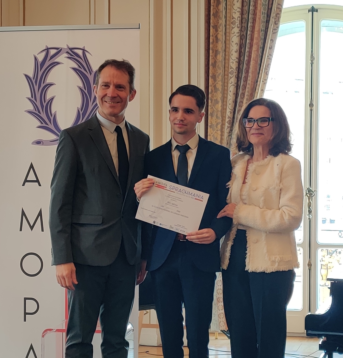 Der französische Botschafter, Herr Peyraud, wies in seiner Rede auf die Bedeutung der Beherrschung von Fremdsprachen im Allgemeinen und auf die Wichtigkeit der französischen Sprache, die auf allen fünf Kontinenten gesprochen wird, im Besonderen hin. Er zeigte sich beeindruckt von dem überaus hohen sprachlichen Niveau der jungen Leute und überreichte gemeinsam mit Frau Roux, Präsidentin der AMOPA, in Anwesenheit hochrangiger Vertreter:innen des Bildungsministeriums, der Industriellenvereinigung, des Institut français und der Apfa die Preise.