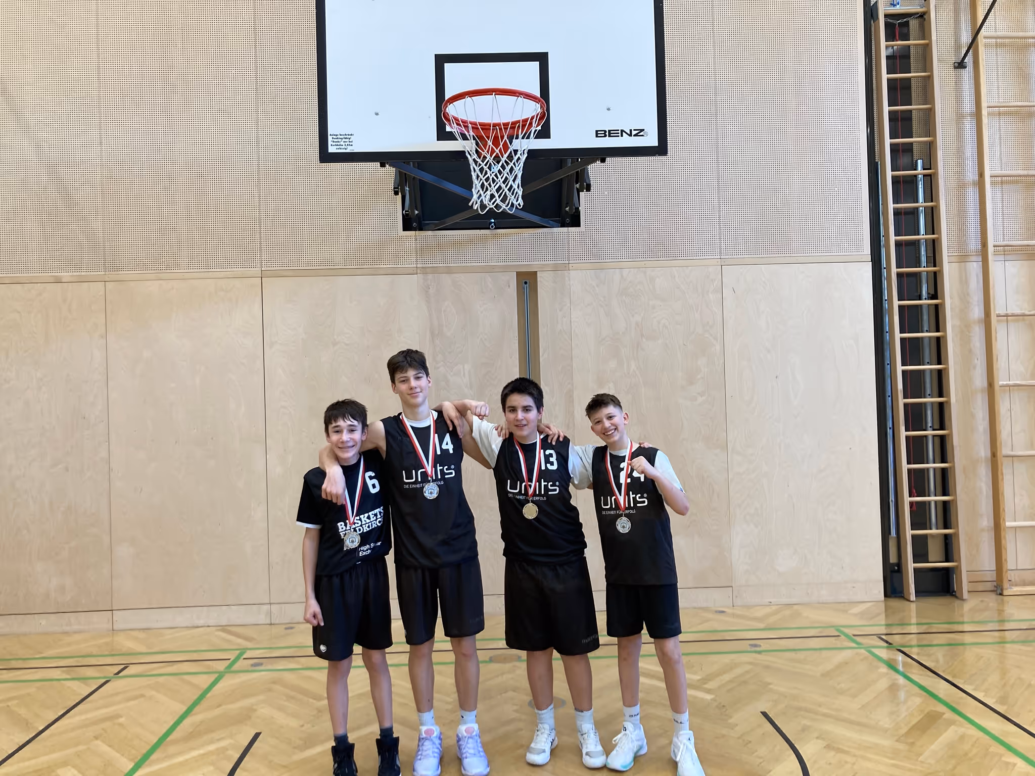 Noch erfolgreicher verlief die Teilnahme an den 3x3-Bewerben in Rankweil! Das Team der 1bd-Klasse, bestehend aus Yamen Salem, Louis Zündel, Leonard Fritsche und Ayman Mamek, qualifizierte sich für das Finale, wo es sich allerdings der Sportmittelschule Schendlingen geschlagen geben musste.