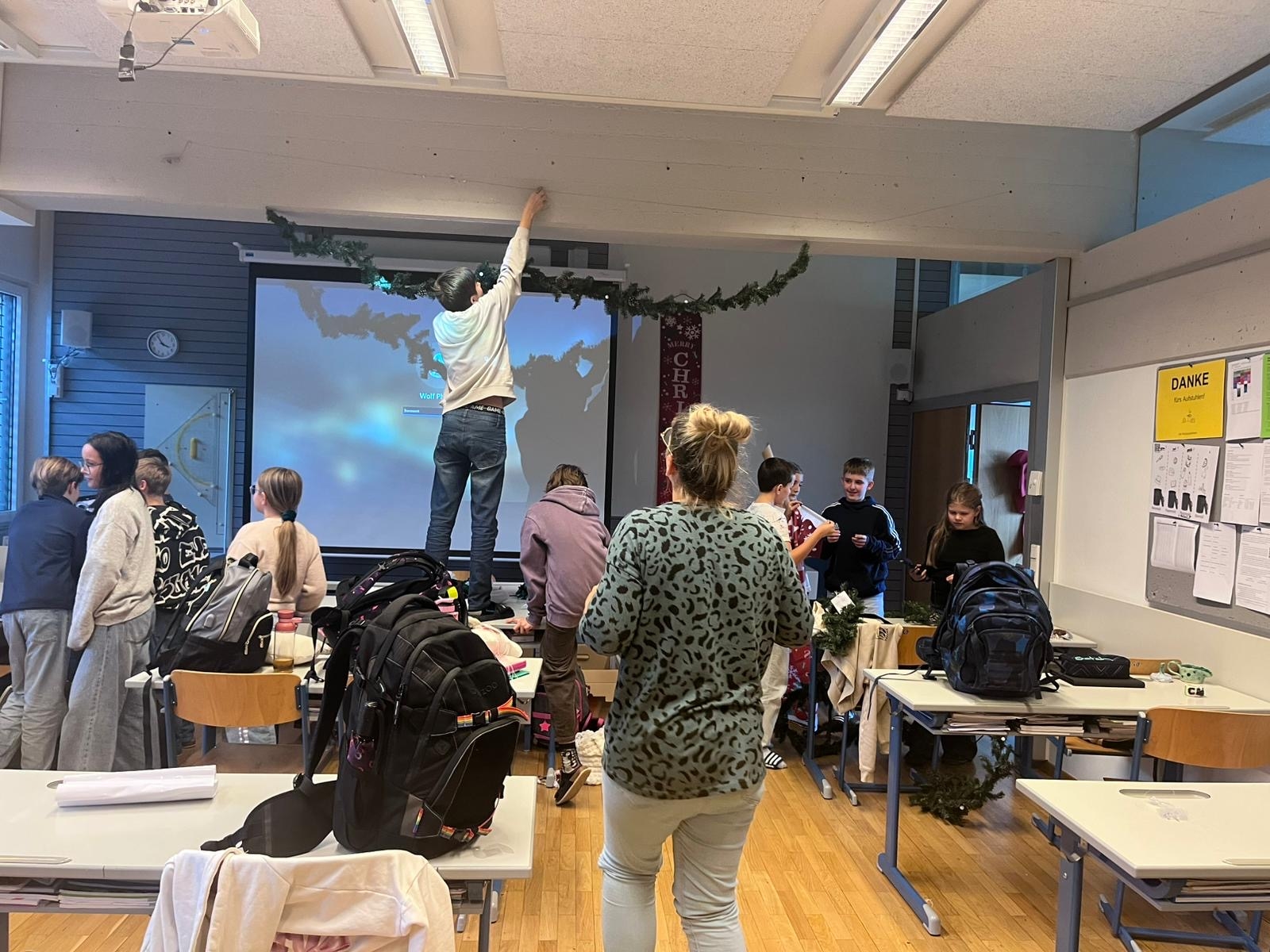 Der Mittelpunkt unseres Klassenzimmers ist nun ein wunderschön geschmückter Weihnachtsbaum. Mit glänzenden Kugeln und liebevoll eingepackten Geschenken darunter verbreitet er sofort eine warme und gemütliche Atmosphäre. Doch das war erst der Anfang: Wir haben bunte Fensterbilder angebracht, die fröhliche Motive zeigen und den Raum noch heller und freundlicher wirken lassen. Ein besonderes Highlight, das für viele Lacher und Staunen sorgte, ist der riesige, aufblasbare Weihnachtsmann, der nun über unser Klassenzimmer wacht. Zusätzlich haben wir festlich dekorierte Zweige aufgehängt, die dem Raum einen natürlichen und winterlichen Charme verleihen.